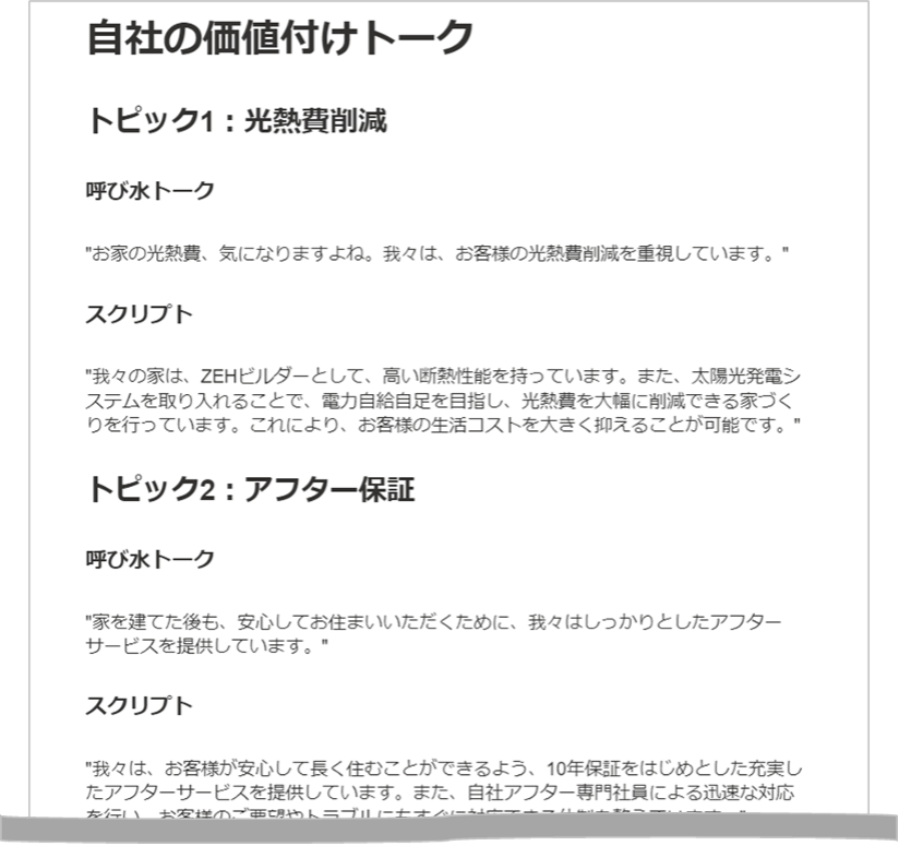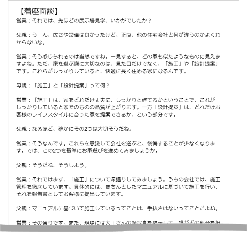 当社の強みは、住宅・不動産業界に精通したコンサルティングノウハウと業界での営業商談における多様なユースケース知見を保有していることです。営業現場の課題として、多くの営業担当者が多忙により商談前の設計が不十分なままお客さまと商談を行っています。そのような現場において、本ソリューションがお客さまの事前情報などから迅速に重要な価値付けトークと商談シナリオを作成し営業担当者に提供することで、住宅・不動産業界の営業力の底上げと業務効率化を実現します。