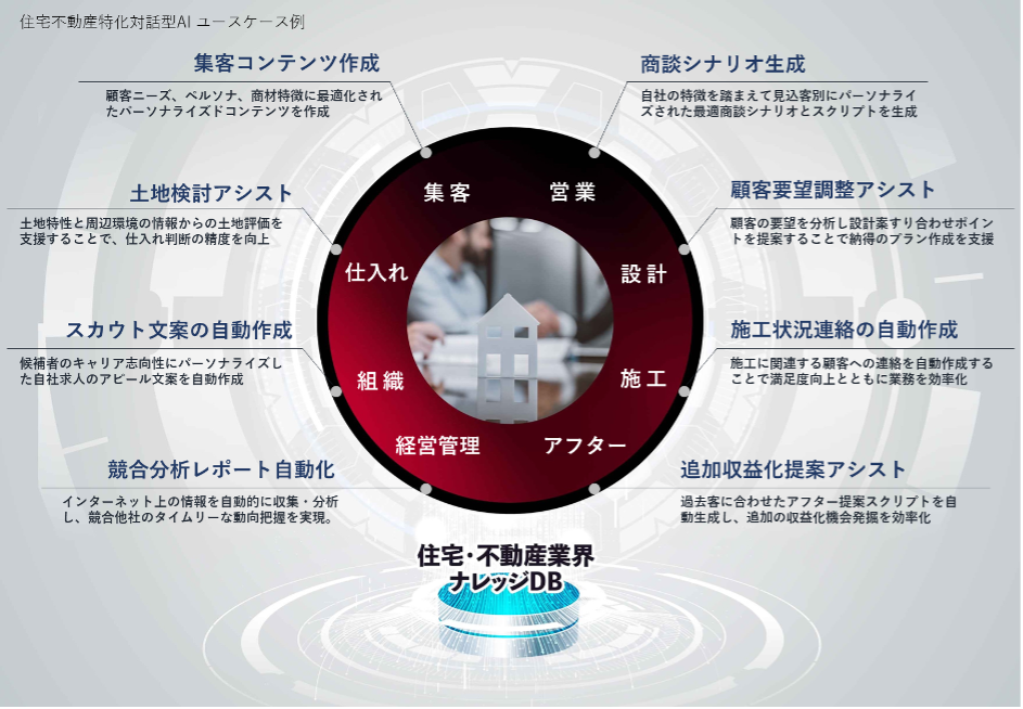 当該環境を活用したドメイン特化型の生成AIソリューションを構築する取組の第一弾として、当社が特に業界のナレッジやデータを保有している「住宅・不動産」業界を対象に、「住宅不動産特化の対話型AI(生成AI)」(以下、本ソリューション)をリリースいたします。属人的になりがちな住宅・不動産業界における具体的な業務シーンに特化した生成AI活用によって、AIを活用した高度な業務効率化の推進を可能にします。