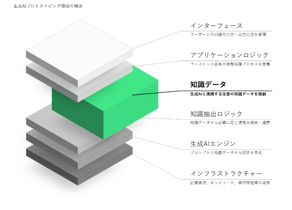 ■生成AIと知識データを掛け合わせるプロトタイピング環境のレイヤー構造図。任意の知識データを組み込むことで、迅速にプロトタイピングの開始が可能。