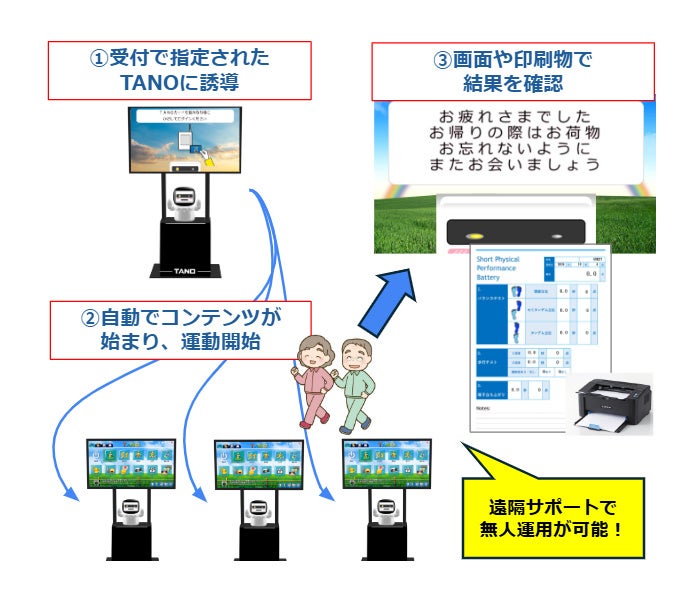 受付用・運動用・レポート用のTANOを連携させることで、利用受付からトレーニング、結果の確認までを自動で行えます。特に、受付用TANOが全体を統括して「誰が・どのTANOを・どの順番で使うか」を案内できるため、スタッフの常駐が不要となり、運営コストを抑えながら展開できる点が大きな特徴です。