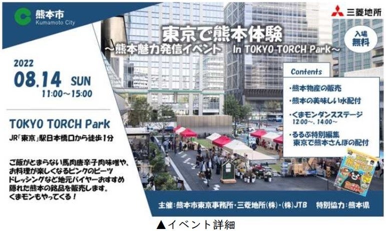三菱地所株式会社と株式会社JTB は、本年4月1日にTOKYO TORCH を活用した地方創生に関する連携協定を締結し、地方自治体・地域の魅力や文化の発信等を協力して推進することとしております。この度、連携協定に基づく第一弾の取組として、JTB が首都圏における観光プロモーションの企画・運営を受託している熊本市(熊本市東京事務所)と連携し、TOKYO TORCH において熊本の魅力を体感するイベントが実現いたします。