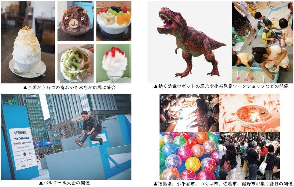 「TOKYO TORCH 1周年まつり」は、「かき氷フェス&アイスパーク」、「キッズパーク」、「スポーツフェス」、「地方創生夏祭り」の4タームで約1カ月間にわたり開催し、主なコンテンツとして、「涼を味わうかき氷店の出店」、「動く巨大恐竜ロボットの展示や化石発掘ワークショップ」、「パルクールの大会・体験会やスラックライン、ダブルダッチの体験会」、「TOKYO TORCH連携自治体が出店する縁日」等を実施予定です。