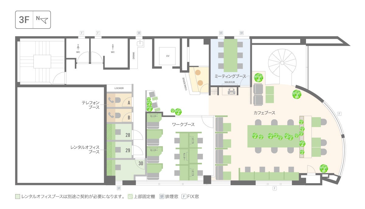 席数:【コワーキングスペース】オープンスペース30席/固定席3席 【レンタルオフィス】30戸