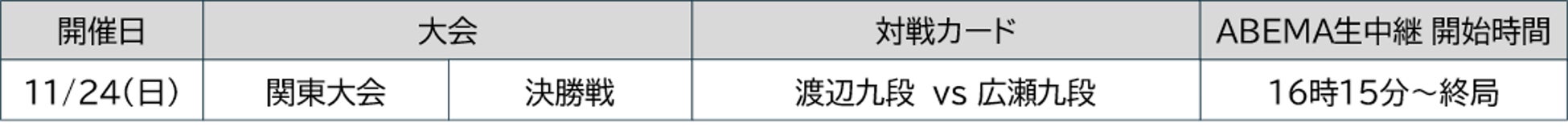 「将棋日本シリーズ JTプロ公式戦」(以下「JT杯」)決勝戦(関東大会)は、通算4度目の優勝を目指す渡辺明九段と藤井聡太JT杯覇者を準決勝で下して5年ぶり2回目の決勝進出を決めた広瀬章人九段の対局。東京都江東区の東京ビッグサイト東展示棟4・5ホールで開催される。事前申し込みにて当選した観戦者や同会場で開催される「テーブルマークこども大会」参加者の目の前で、公開対局として熱戦が繰り広げられる。また、その模様は16時15分からABEMAでも生中継される。
