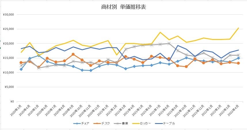 チェア同様に法人需要が引き続き昨年を上回っており、デスク/フリーアドレス・タイプともに安定していた。先月と比較して若干単価は減少したものの、ほぼ現状を維持している状況である。