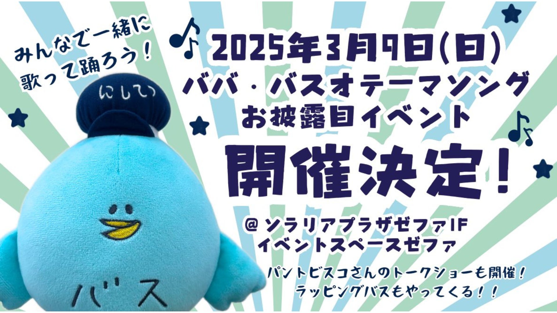 株式会社アプラ(東京都渋谷区、代表取締役:新妻 快介)が運営する企業向け音楽制作サービスMusic With(ミュージックウィズ)は、西鉄バス※の公式キャラクター「ババ・バスオ」のテーマソングを制作しました。そのテーマソングのお披露目イベントが2025年3月9日(日)にソラリアプラザで開催されます。