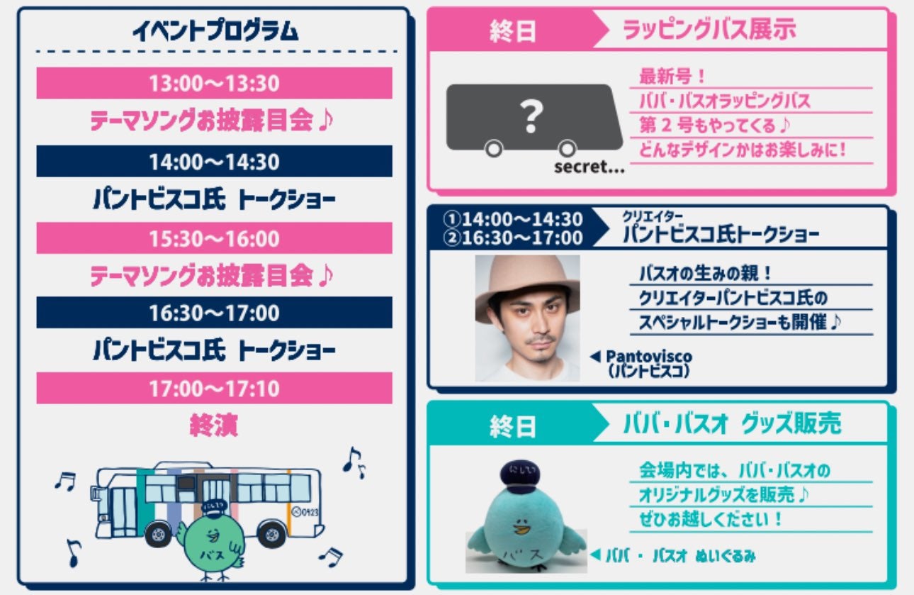 今回のお披露目イベントでは歌って踊れるテーマソングのお披露目が予定されていますが、それだけでは終わりません。Instagramのフォロワー数約50万人の人気クリエイターPantovisco(パントビスコ)さんによるトークショーが開催されます。ババ・バスオの生みの親だからこそ語れる内容は一聴の価値があります。他にもラッピングバスの展示やグッズの販売なども行われ、いつ足を運んでも楽しめるイベントです。