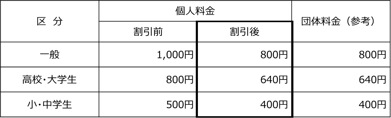 | 団体(20人以上) | 800円 | 640円 | 400円 |