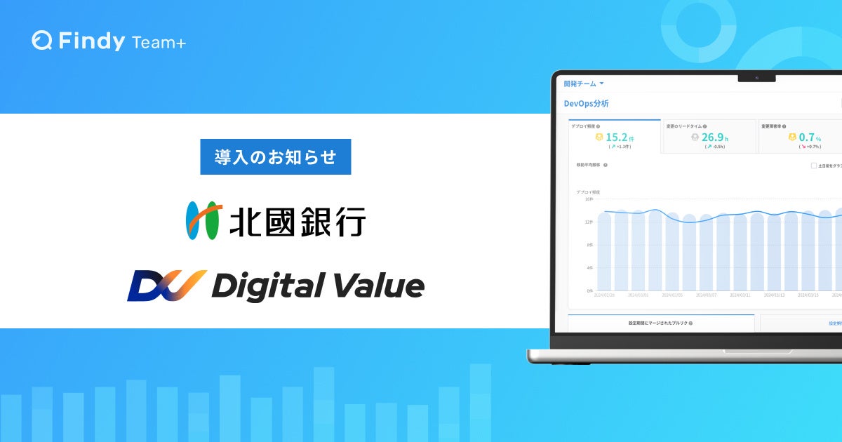 エンジニアプラットフォームを提供するファインディ株式会社(東京都品川区、代表取締役:山田裕一朗、以下「当社」)は、当社が提供する「Findy Team+(チームプラス)」 が、株式会社北國銀行(本社:石川県金沢市、代表取締役社長:米谷治彦、以下「北國銀行」)および同社のデジタル戦略やシステム開発などを担うグループ会社の株式会社デジタルバリュー(本社:東京都千代田区、代表取締役社長:岩間正樹、以下「デジタルバリュー」)にて正式導入されたことを発表します。これにより、エンジニア組織の課題可視化とパフォーマンスを向上し、開発生産性・開発者体験向上を実現します。