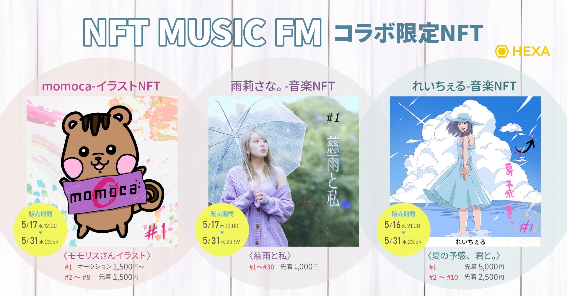 「momoca」、「雨莉さな。」、「れいちぇる」が「NFT MUSIC FM」との限定コラボNFTをHEXA(ヘキサ)で発行