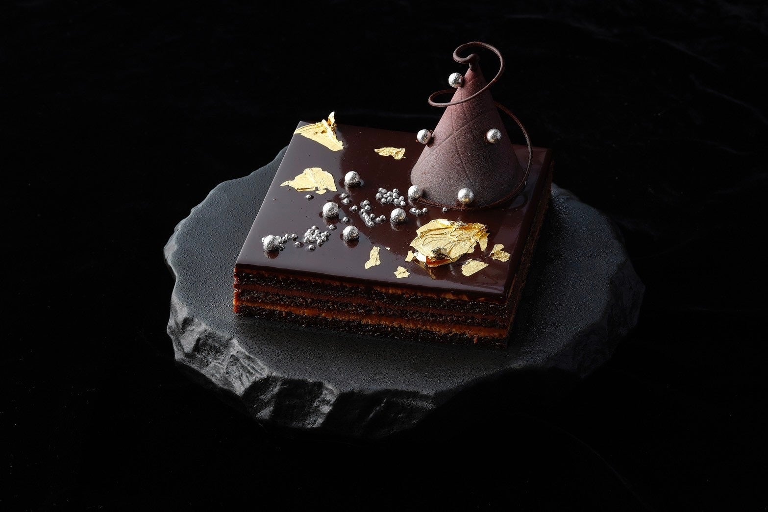 シェフパティシエ 髙田 一哉がフランスで出会った伝統的なオペラのレシピを大切に培い、作り上げたシグネチャ―ケーキ。メインダイニング「イタリア料理 RISTRANTE OZIO 」のデザートとしてもご提供しお客様からも大変人気のあるケーキです。オペラの香りの要となるコーヒーは、ホテルで提供しているエスプレッソをじっくりと蒸らして香り高いコーヒーエキスを抽出。このコーヒーエキスをしみこませた生地は、一口ごとにコーヒーの上品な香りが広がります。またバタークリームはアングレーズを加えコクをプラス。チョコレートのガナッシュは、ヴァローナ社のクーベルチュール(カカオ約70%)を使用した滑らかなくちどけです。表面にあしらった金箔が映し出すそのゴージャスな雰囲気と、何層にも重なるケーキの断面は、豪華絢爛なパリのオペラ座の観客席を表しており、クリスマスのひとときを華やかに演出します。