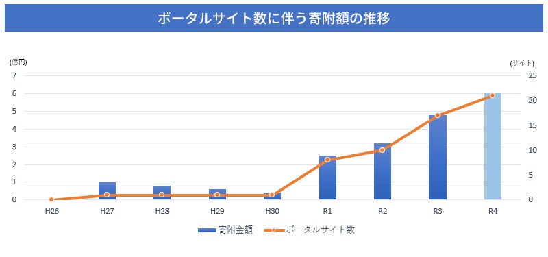 - 掲載ポータルサイトの増加に連動して寄附額が増加。自動連携だから増やすのも簡単