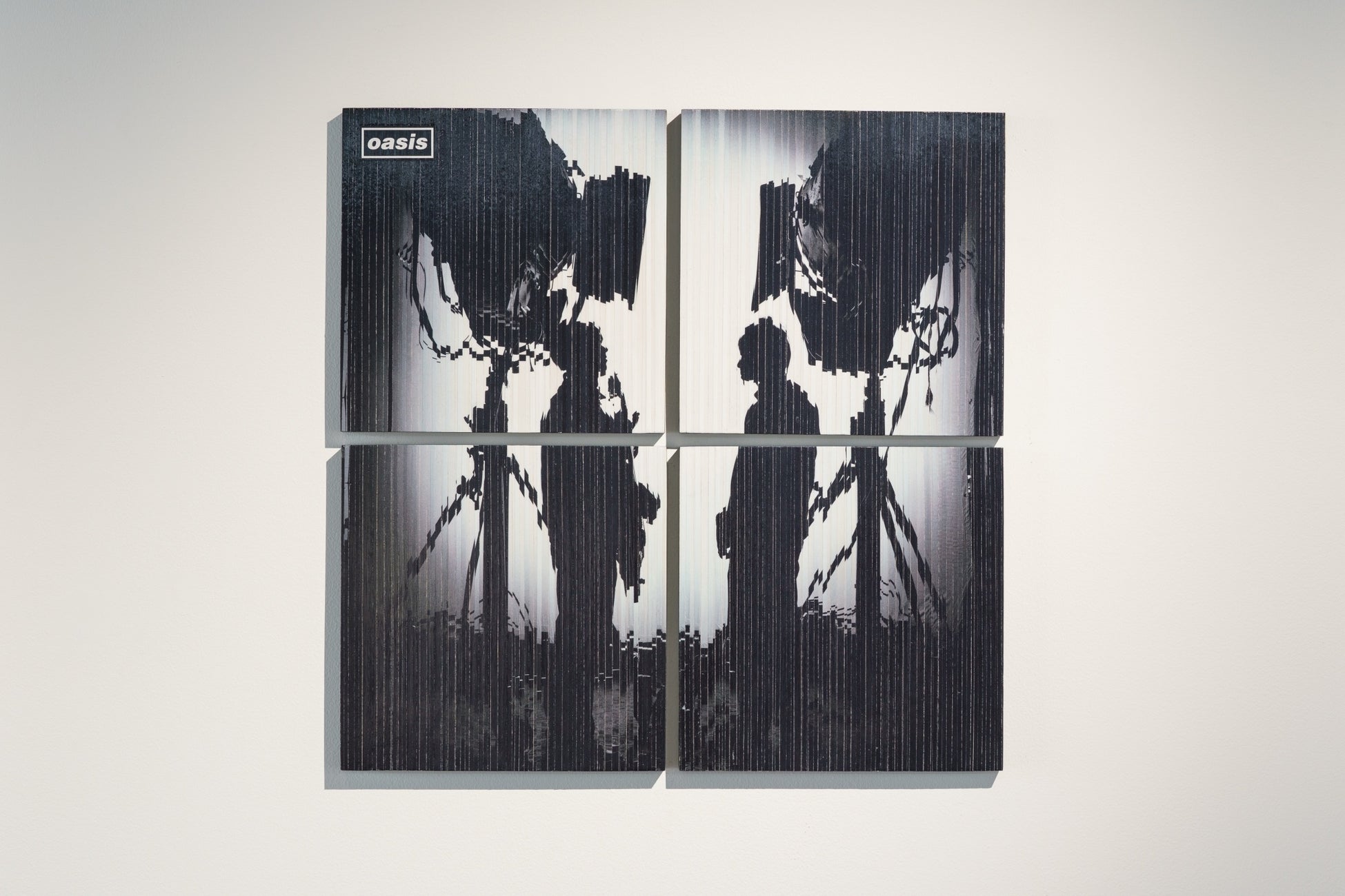 両作家のコラボレーションとして制作されたのは、ノエルとリアムのギャラガー兄弟のポートレートを用いたコラージュ作品。兄弟の目が重なってふたりの顔がぼやりと浮かんでくる本作は、仲違いを繰り返しながらも鋭い才気を衝突させてきたバンドの像を立体的に示すような構図になっている。