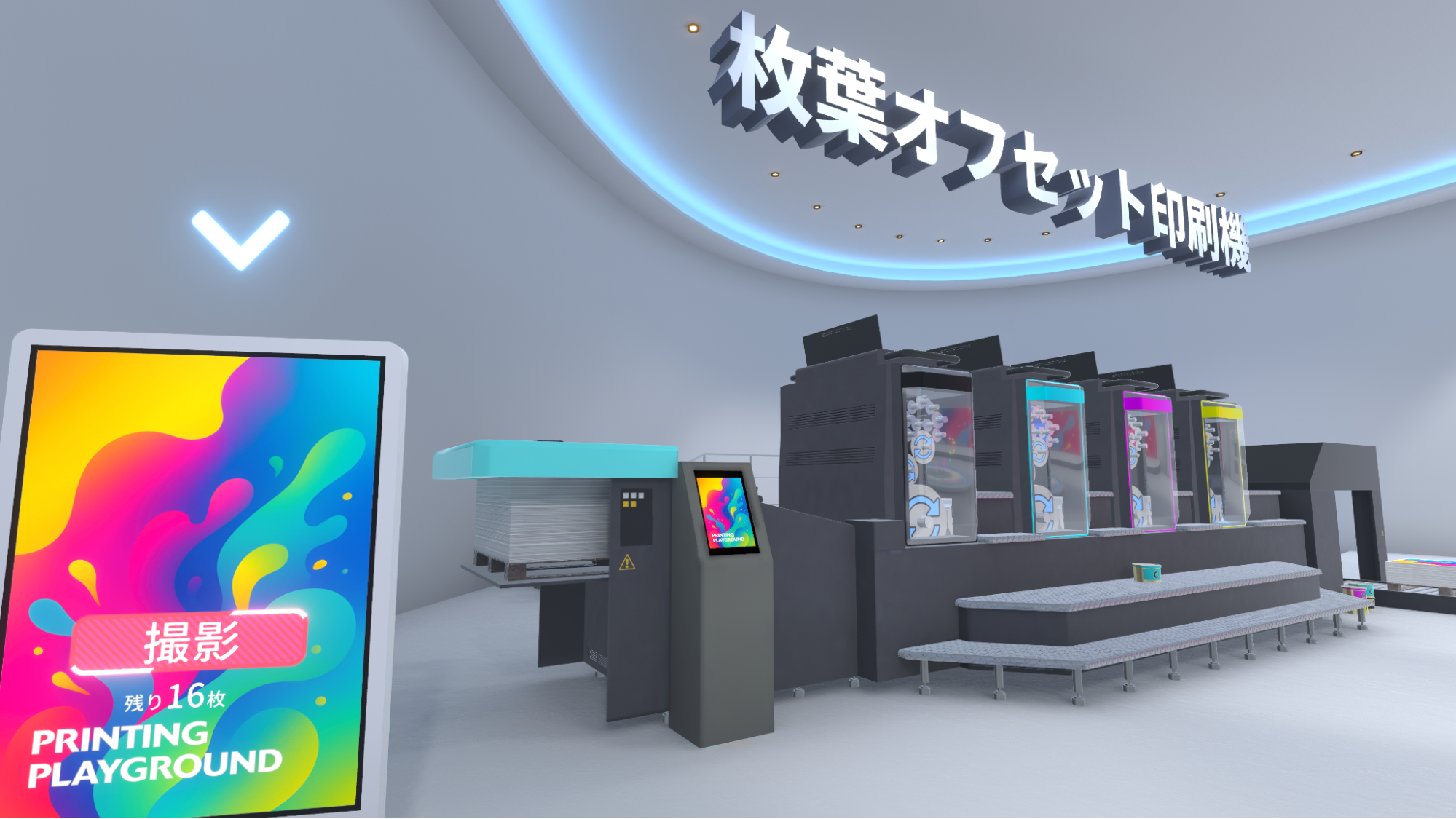 実際に収録した稼働音が響く空間のなかで、巨大印刷機の仕組みを間近に観察できます。さらに、「厚盛ニス加工」や「フロッキー加工」といった特殊印刷技術をVRならではのギミックで可視化し、印刷のプロセスや表現の魅力を直感的に学べる空間となっています。