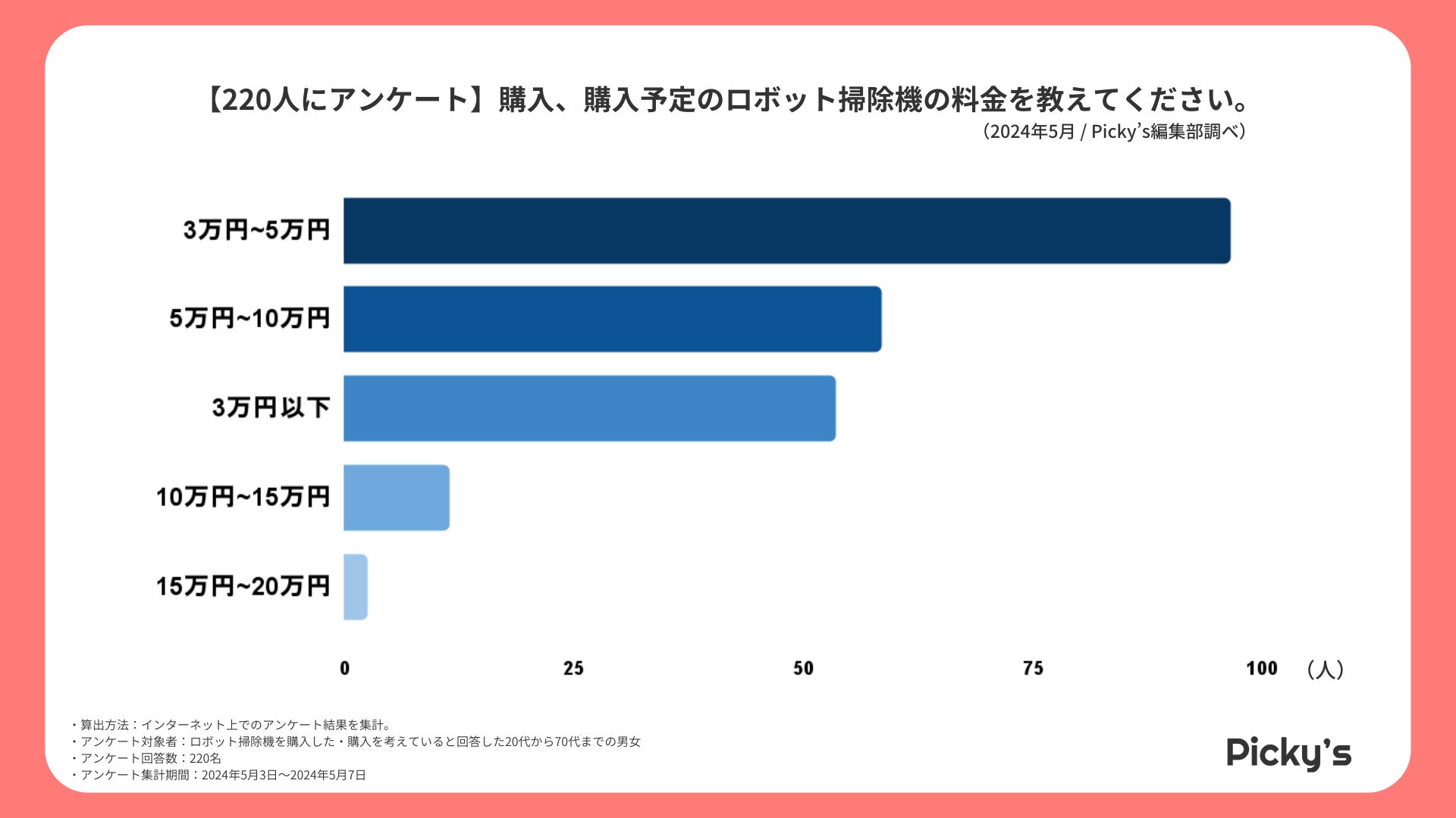 多くの人が「3万円~5万円」の価格帯を選んでいることが分かります。この価格帯は、比較的手頃な価格で品質の良いロボット掃除機を入手できるため、多くの人々に人気があるのではないでしょうか。