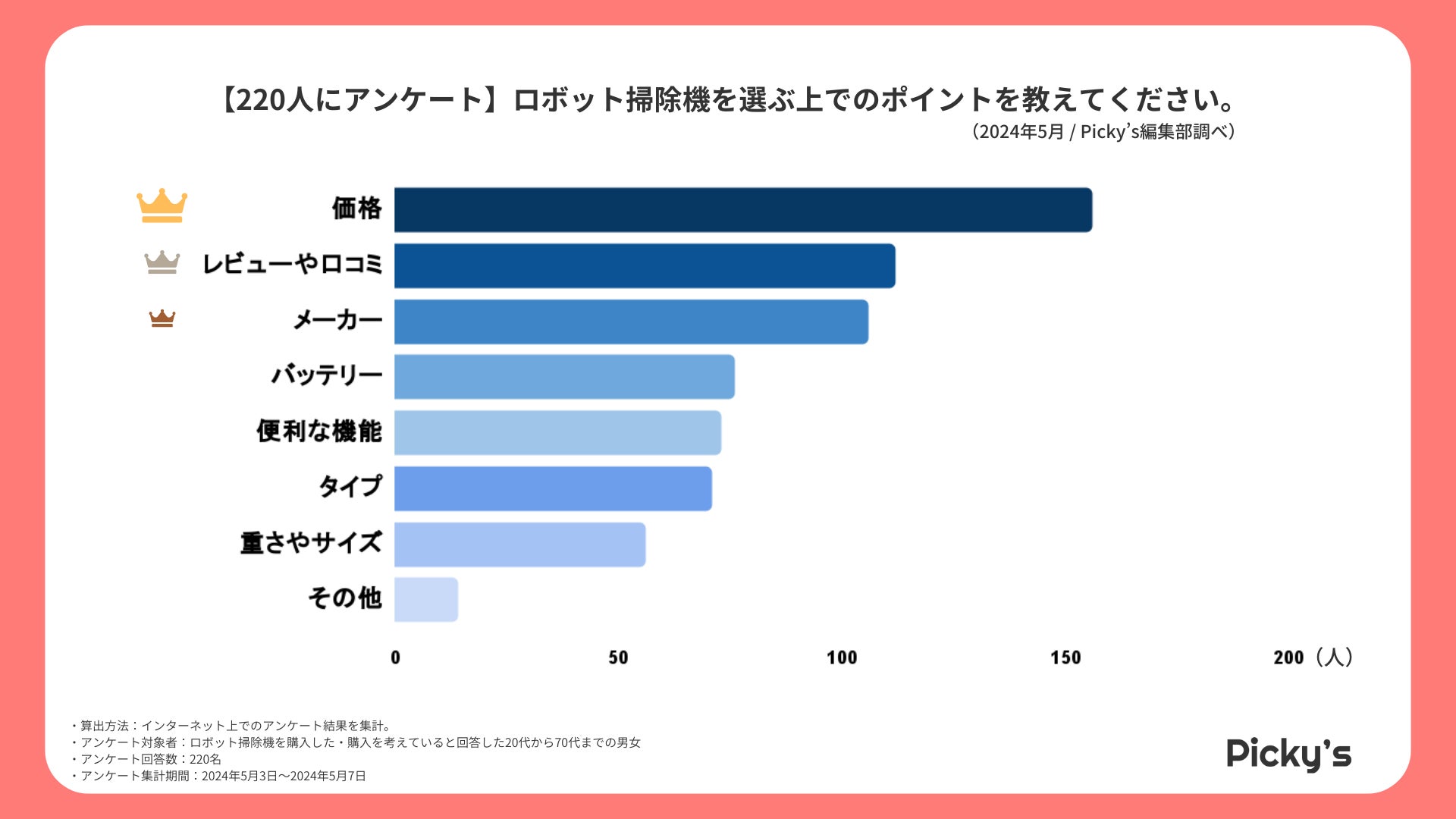 「Picky’s」は、インターネットショッピングにおいて、購入前に試せない・選ぶべきものがわからないという課題の解決を目標に、あらゆる商品のおすすめランキングや検証レビューを紹介するサイトです。このたびPicky’s(https://rentry.jp/)では、ロボット掃除機についてインターネット上でアンケート調査を行いましたので発表いたします。