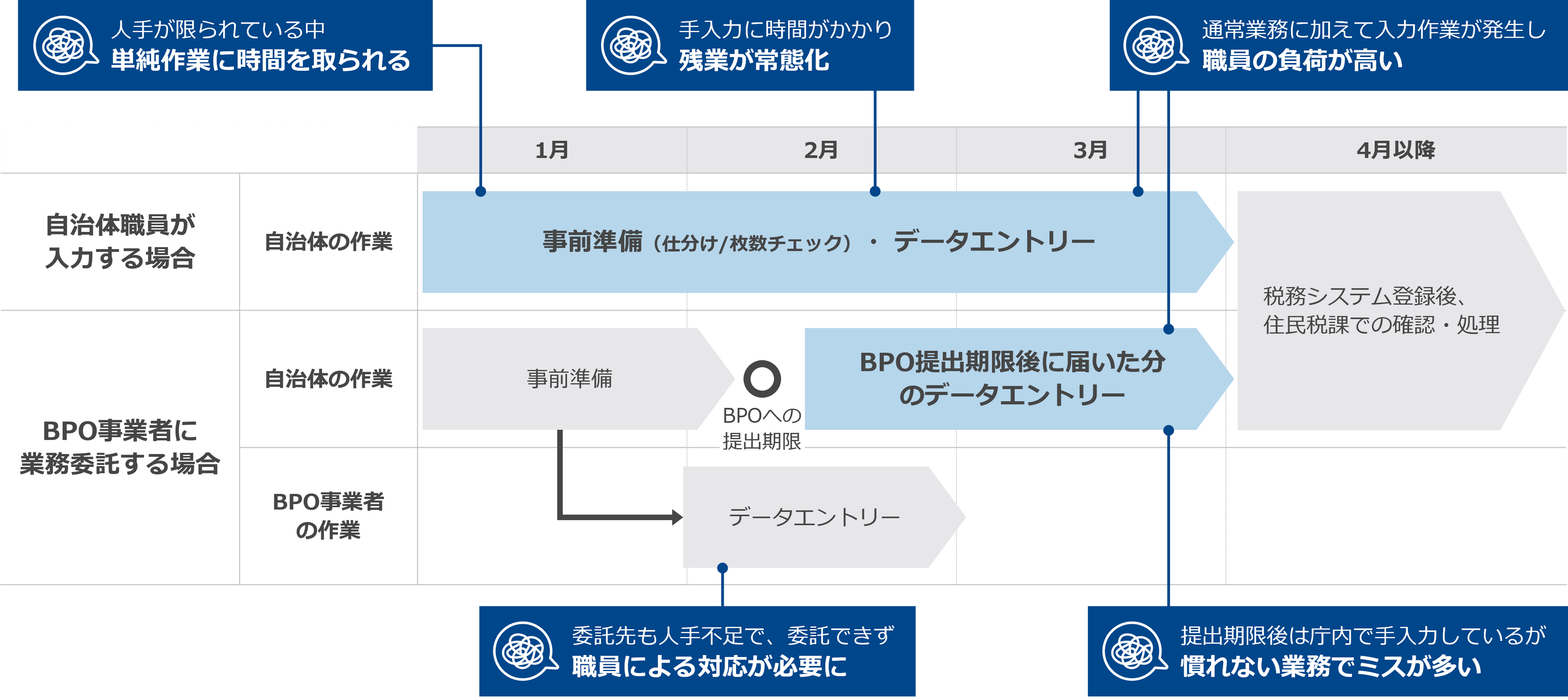 特に、BPO事業者への委託が難しい自治体では、通常業務に加えて手入力などのすべての作業を職員自身が担う必要があり、限られた人員の中で慣れない単純作業に多くの時間を割かざるを得ない状況が続いています。一方、BPOに業務委託している自治体でも、契約期間終了後に届く帳票は自治体内で職員が処理する必要があり、結果として「隠れた負担」が発生しています。