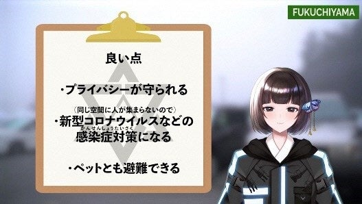 この動画を通じて、車中泊避難におけるメリット、デメリットや注意点を紹介することで、避難方法の1つとして認識していただくことを目的としています。また、児童生徒の防災学習教材としても活用いただけるよう分かりやすい言葉、ふりがな入りで作成しています。
