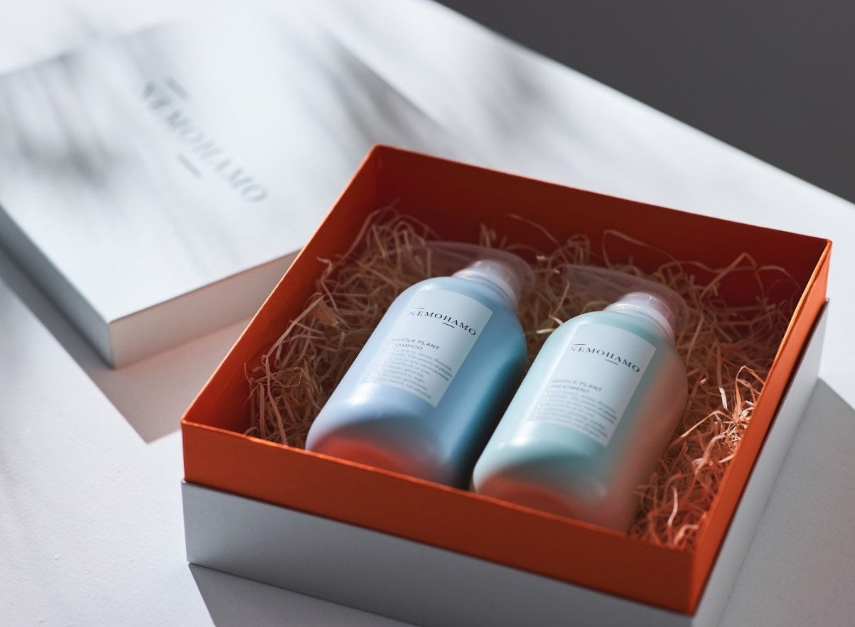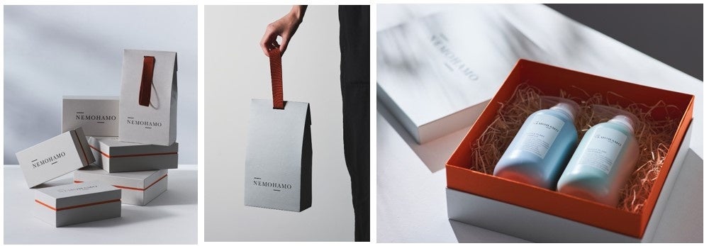 さらに同日より、ボックスとバッグの2 タイプをご用意したギフトラッピングサービスをスタートいたします。NEMOHAMO のスキンケアやヘア&ボディケアなど、様々なアイテムの組み合わせに対応するオリジナルのサイズ設計。洗練された印象のグレーを基調に、ブランドのキーカラーであるオレンジが印象的なデザインに仕上げました。