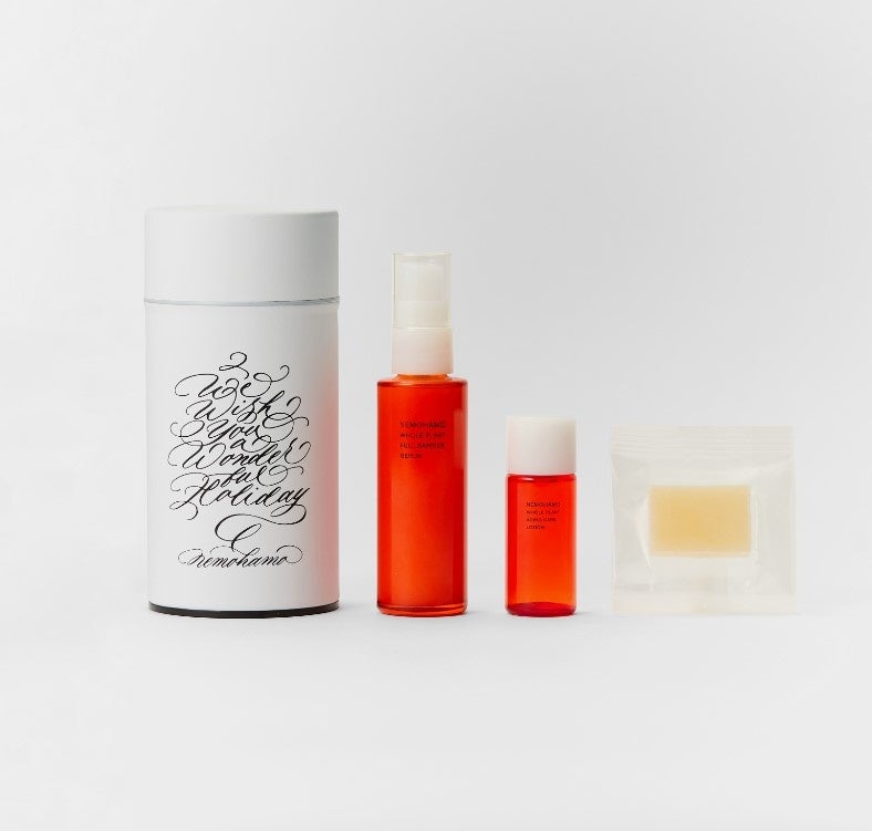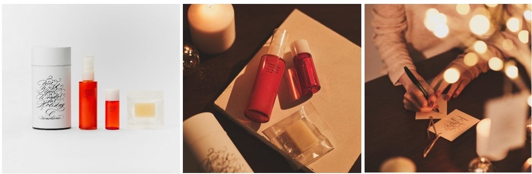 ホリデーキットのテーマは“We wish you a wonderful holiday”。かさつきが気になる季節も、ご機嫌な肌で素敵な休日を過ごしてほしいという想いから、エイジングケア※1 に優れたオタネニンジンの力をたっぷり体感できるホリデーキットをご用意しました。クリスマスツリーをイメージしたカリグラフィデザインのオリジナル缶に、「フルバリア美容液(50mL)」「エイジングケアローション モイスト(20mL)」「プレミアム洗顔ソープ(7g)」のスキンケアアイテムを詰め込みました。オリジナル缶に施されたカリグラフィは、美しく繊細な文字スタイルが支持され、カリグラフィ作家として活躍する村田瑞記氏がデザイン。使用後はご自宅の小物入れとしてもお