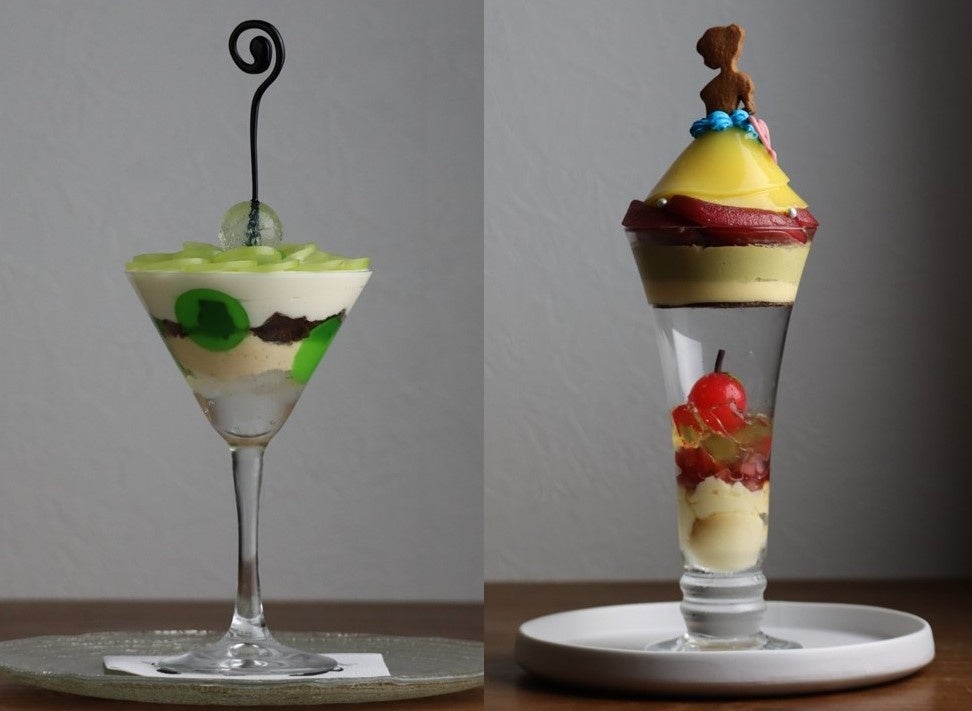 18時に開店し、まるでバーのような雰囲気の店内で独特なネーミングのパフェがそろう札幌・すすきのの「夜パフェ専門店Parfaiteria PaL (パフェテリア パル)」が初出店。北海道産の旬の果物をジュレやソルベにして仕上げた、通常夜にしか味わえない大人向けのパフェを会場で楽しめます。シャインマスカット、球体のレモンゼリー、飴細工で傘をイメージしたパフェ(写真左)や「白雪姫」をイメージしたリンゴのパフェ(写真右)など4種を展開します。※「白雪姫 注)毒りんごは入ってません」はアルコールを使用しています。