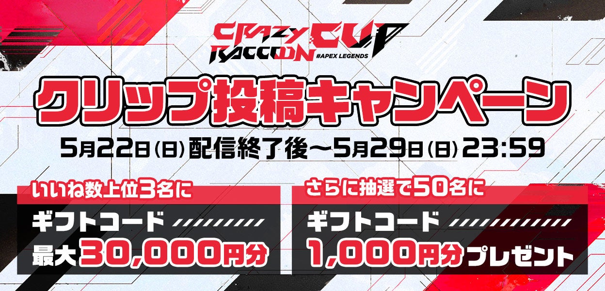 また、大会開催にあわせて5月22日から29日の期間中、CRカップのクリップ投稿キャンペーンも開催いたします。国内最高峰の「Apex Legends」の戦いを、ぜひお楽しみください!