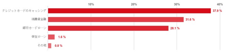 「クレジットカードのキャッシング」が37.9%で最も多く、「消費者金融」が31.6%でこれに続いた。また、「銀行カードローン」との回答も2%あった。