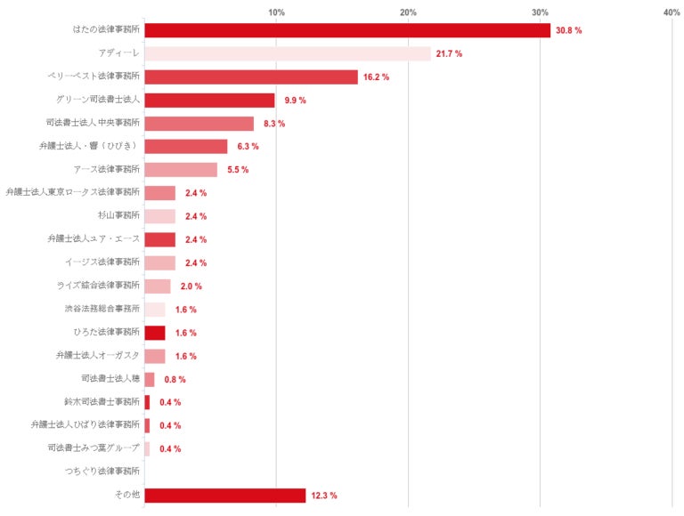 「はたの法律事務所」が30.8%で最も多く、「アディーレ」「ベリーベスト法律事務所」が21.7%、16.2%でこれに続いた。なお、「その他」の回答には「地元の法律事務所」という答えが多かった。