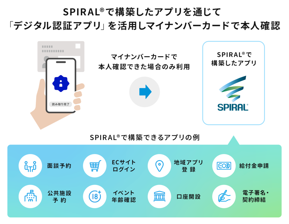 「SPIRAL ver.1」にて構築した地域アプリや自治体の給付金申請フォーム、金融機関における口座開設などのWebアプリケーションを経由して本人確認・認証をおこなう際に、「デジタル認証アプリ」によるマイナンバーカードを利用した安全かつ厳格な本人確認・認証が可能となります。