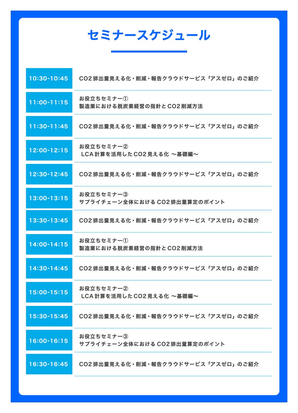 本展示会のブースではミニセミナーを行い、各企業の取り組みや事例、提携や導入背景の紹介を通して、「アスゼロ」の製品情報、脱炭素経営のヒントとなりうる情報をご紹介します。