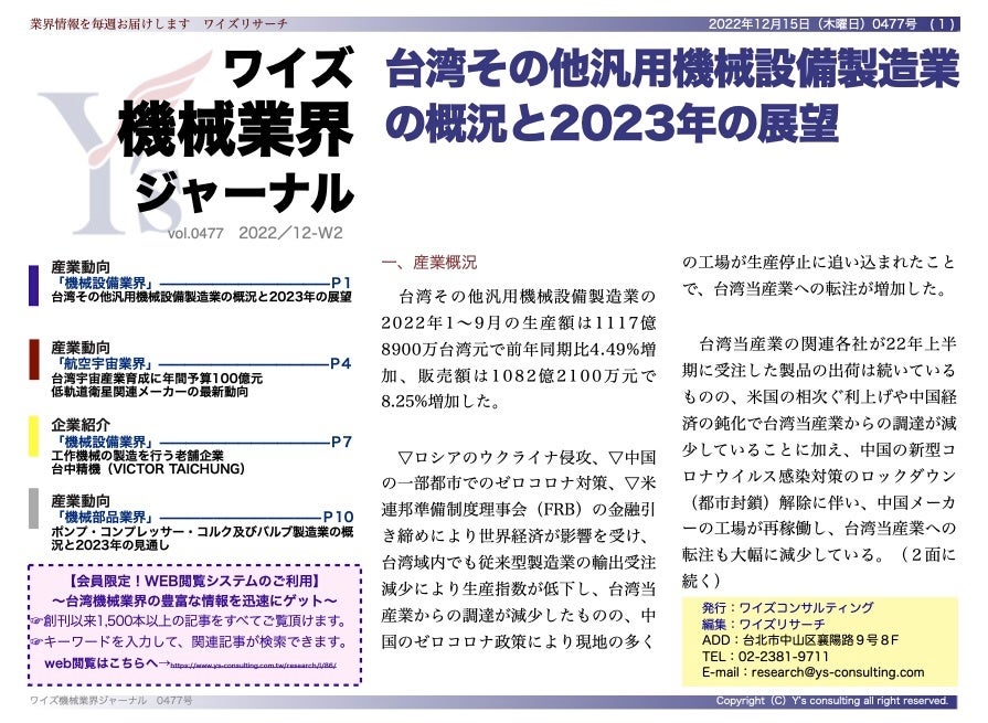 ワイズコンサルティング グループ(本社:中華民国台北市、代表取締役:吉本康志)は台湾機械業界専門誌「ワイズ機械業界ジャーナル」の2022年12月第3週号を発行しました。今週号では、機械設備業界、航空宇宙業界、工作機械老舗企業の台中精機(VICTOR TAICHUNG)と機械部品業界の動向を紹介します。