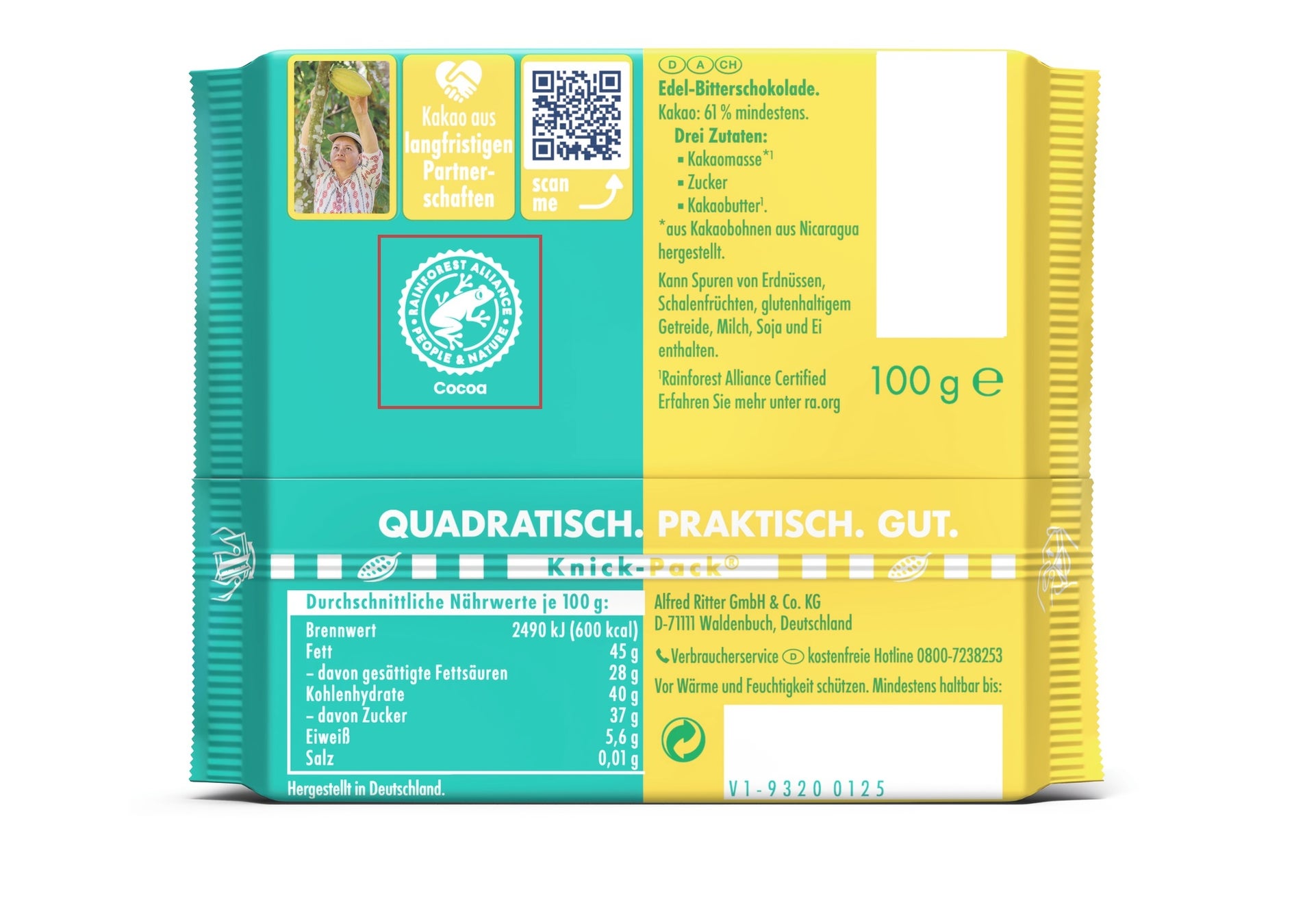 創業者の妻、クララ・リッターは、地元のサッカーファンが工場に隣接するスポーツ場に行く途中にリッターのチョコレートを好んで手に取ることに気づきました。彼らは、当時非常に人気があったスポーツジャケットのポケットにチョコレートを入れていました。しかし、長方形の形ではポケットの中で折れてしまうことが多かったのです。そこで彼女はポケットに収まるサイズの正方形のスクエアチョコレートにすることをひらめきました。少しコンパクトですが重量はロングバーと同じ100g。これが今日まで愛されているこだわりのスクエアチョコレートの秘密です。