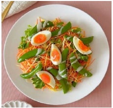 ① スナップえんどうは筋をとり、塩を加えた熱湯でゆで、水にとり水気を切る。ゆで卵は縦4等分に切る。