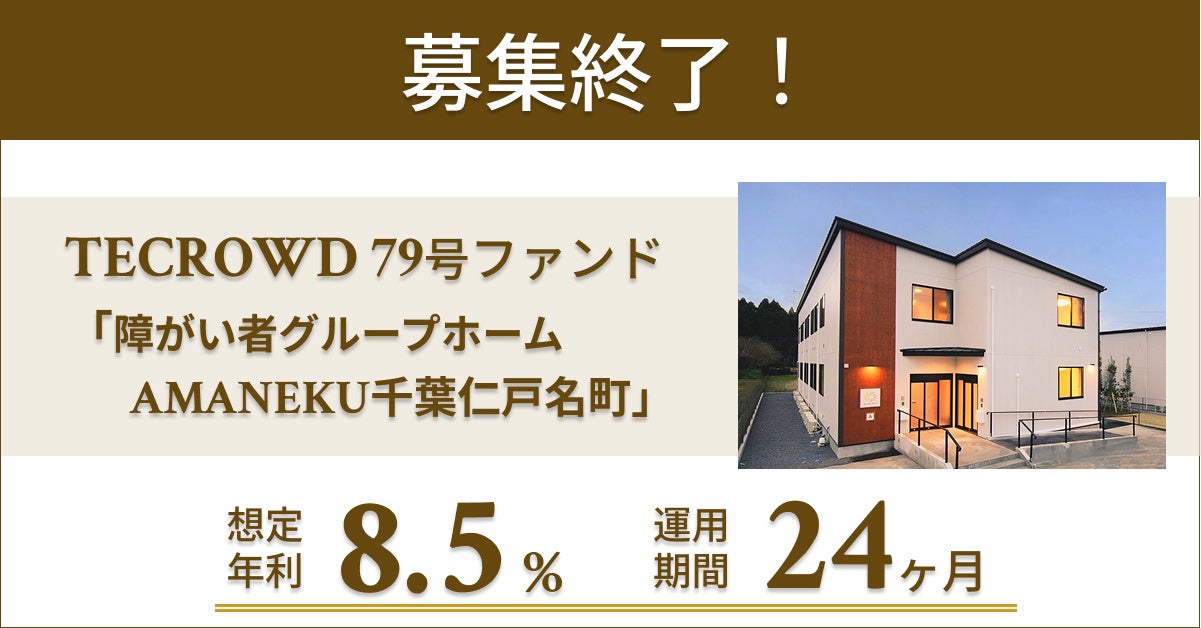 【想定年利8.5%】不動産クラウドファンディング「TECROWD」、「障がい者グループホーム AMANEKU千葉仁戸名町」を投資対象とするファンド募集終了