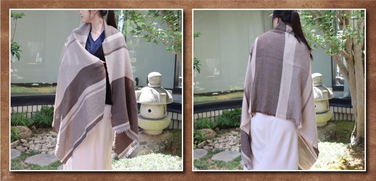 ①ほっとするような暖かさと軽やかさのガーゼストール。肌に馴染む生地でニットが苦手な方にもおすすめ