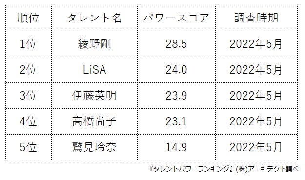 本ランキングは、2022年5月度に実施したタレント調査データ(一部過去実施データ)を利用し、タイトルに応じてランキング形式でまとめたものです。