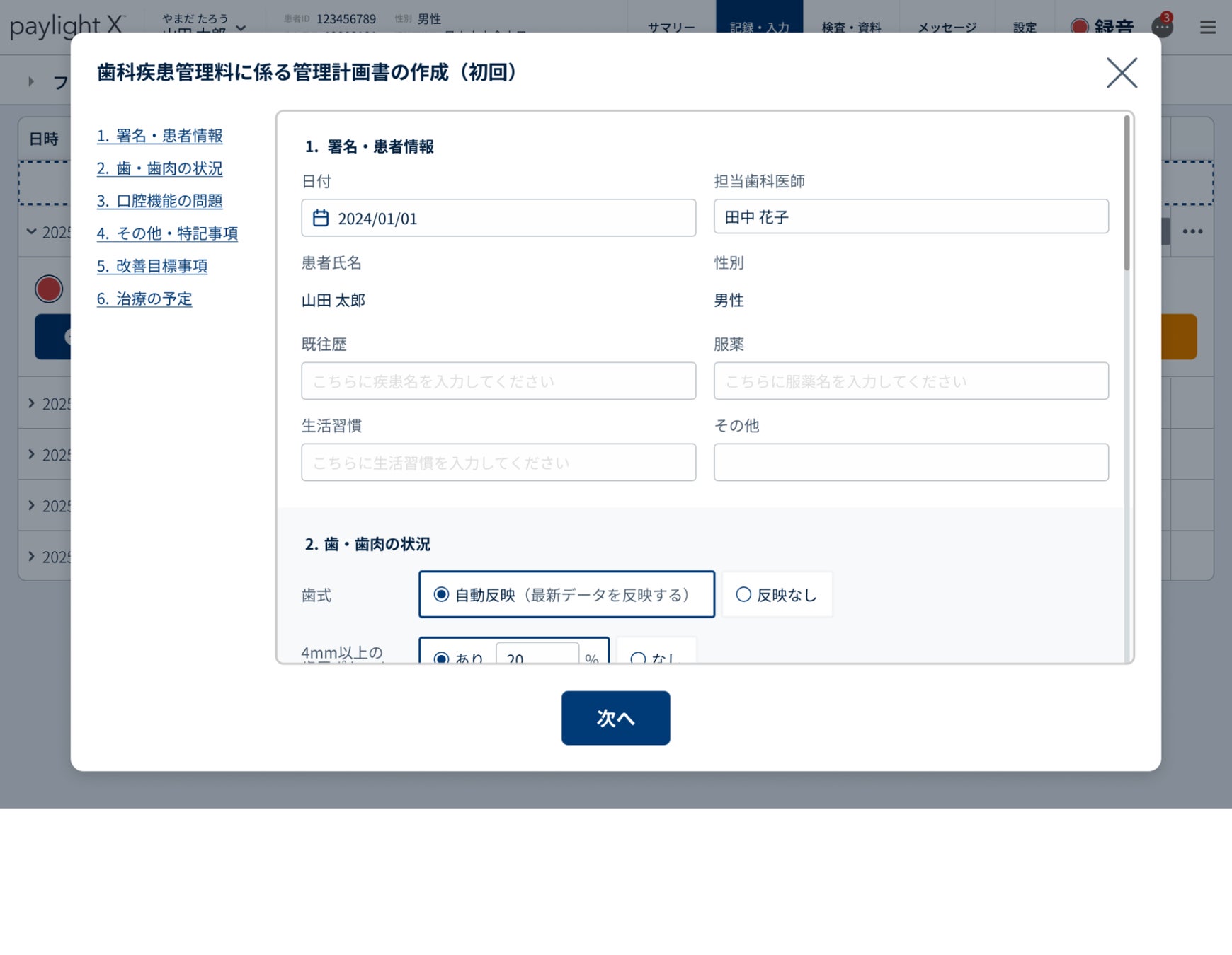 登録された患者情報や歯周組織検検査データを自動反映し、歯科疾患管理用紙を自動で作成。従来の手作業での業務と比較し、作成工数を削減します。また、データ保存によりペーパーレスを実現します。