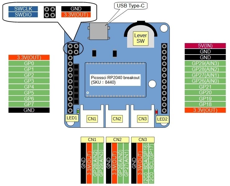 ▶︎ 「Picossci Branch(RP2040搭載)」のピン配置