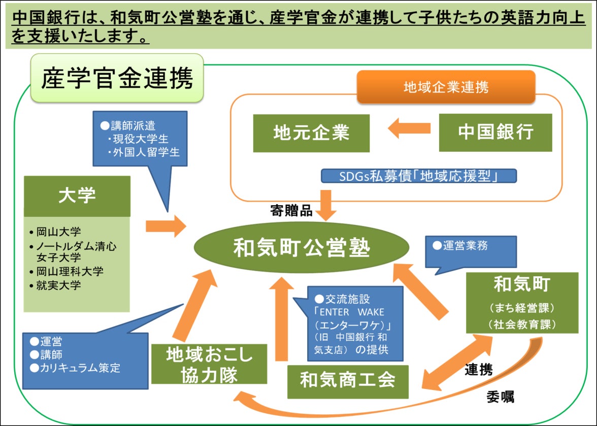 今般、当行では岡山技研工業株式会社、谷尾食糧工業株式会社、恒次工業株式会社、株式会社メイト、計4社の『SDGs私募債「地域応援型」※』の引受けと財務代理人を務めました。その手数料の一部を使い「和気町公営塾(英語塾)」へ教材、備品などの教育に資する物品を当行と同4社の連名にて寄贈いたします。本取組みは、地方公共団体が運営する公営塾への寄贈、および複数社同時引受けによる合同での寄贈として平成29年に当行で初めて実施。本件は、公営塾を再び応援するため、同じスキームにより寄贈をおこなうものです。