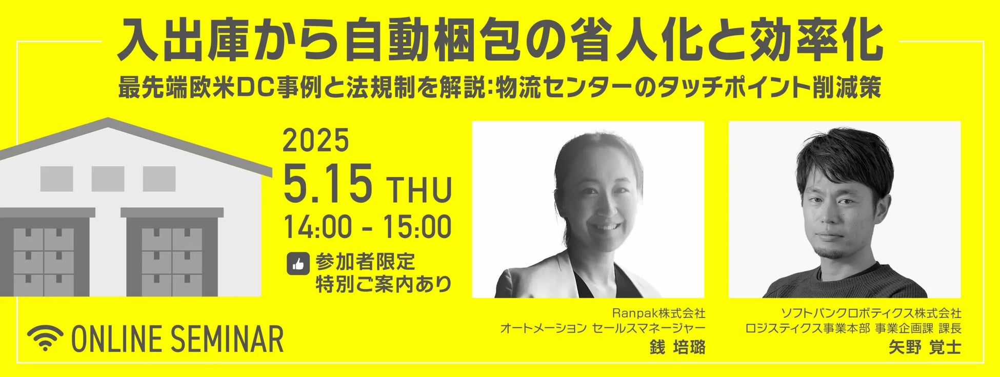 ソフトバンクロボティクス株式会社(本社:東京都港区、代表取締役社長 兼 CEO:冨澤 文秀)は、Ranpak株式会社(本社:横浜市、代表取締役:ヴィンセント・ウィリアム・シェモ、以下「Ranpak」)と法人向けオンラインセミナー「入出庫から自動梱包の省人化と効率化」を2025年5月15日(木)に共催します。また、セミナーに参加された企業の中から抽選で1社に、「現状解析サービス」を無料で提供します。