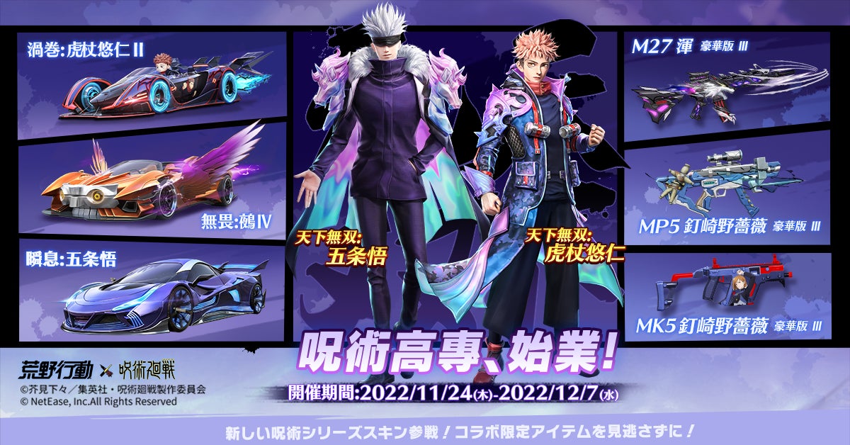 NetEase Gamesが開発・運営する大人気バトルロワイヤルゲーム『荒野行動』にて、2022年11月24日10:00から2022年12月7日23:59の期間中、TVアニメ『呪術廻戦』とのコラボイベント第2弾を開催いたします。