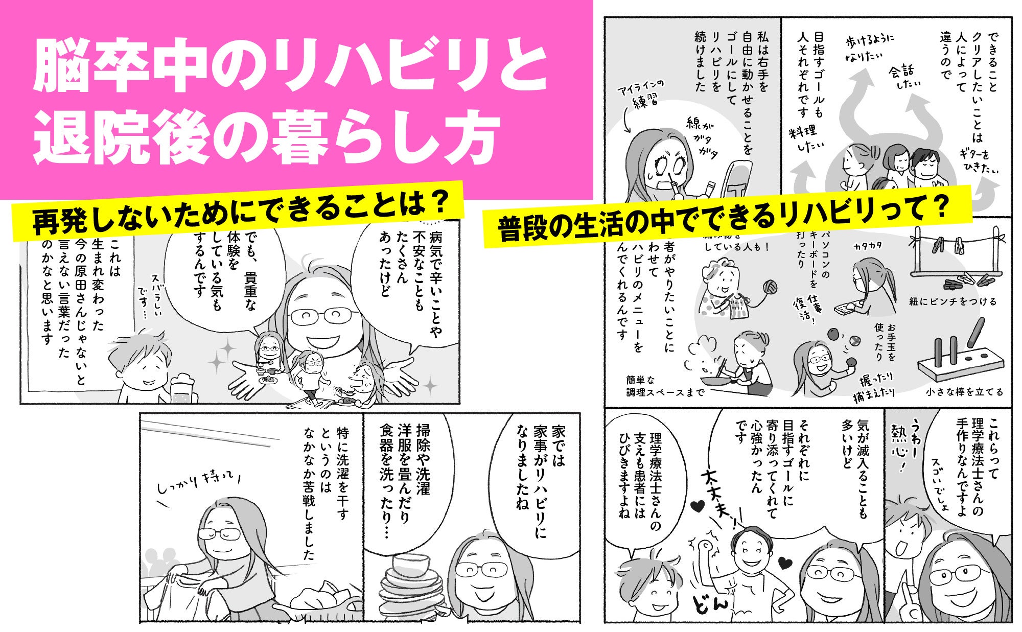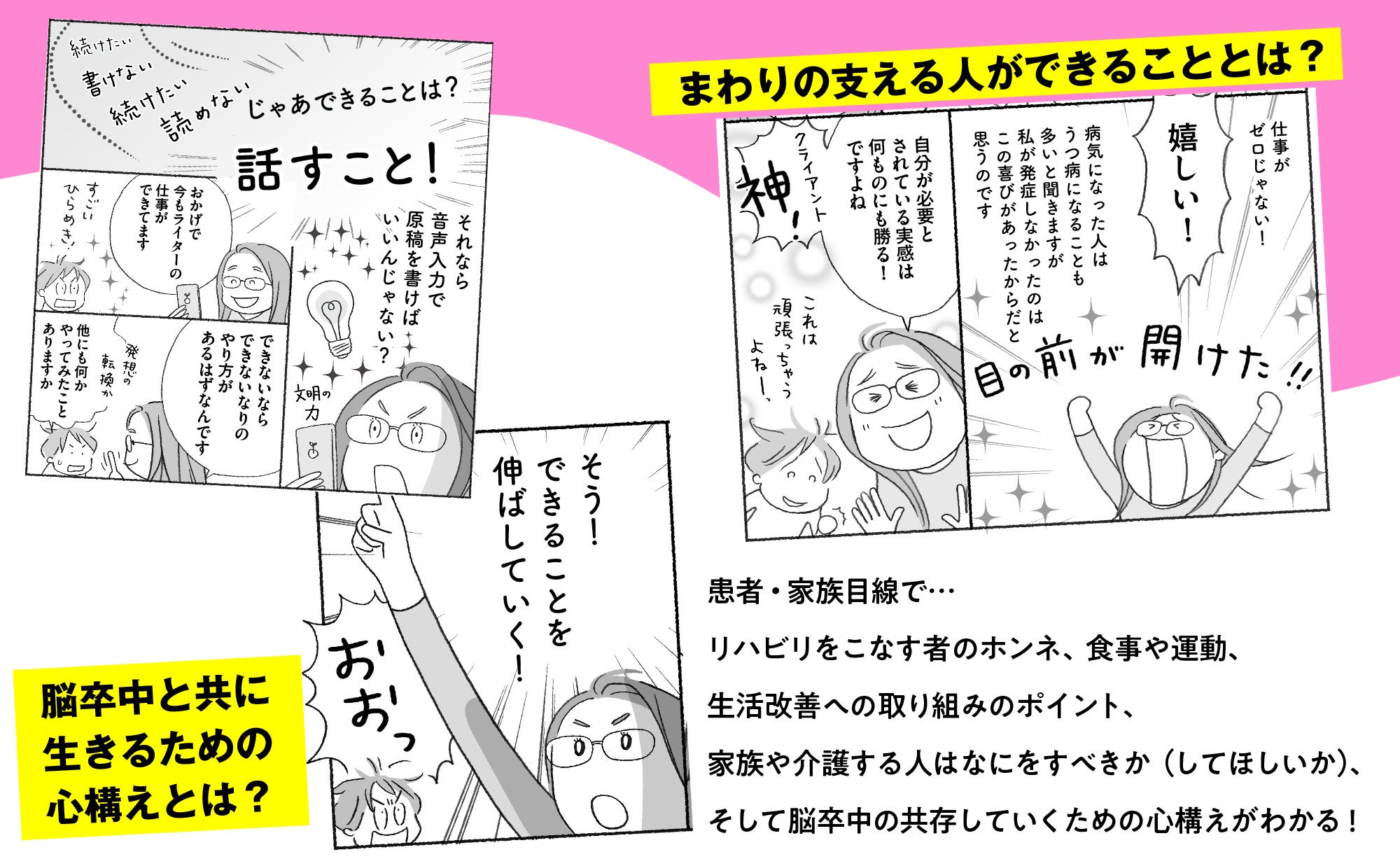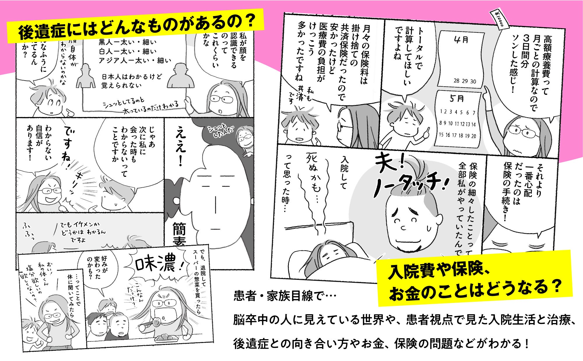 本書は「脳卒中になったら、体はどうなってしまうの?」「治療は?」「後遺症は?」「リハビリは?」「家族やまわりの人は何をすれば?」「これからの生活はどうする?」といった、患者と家族から見た脳卒中の“リアル”を、当事者への材をもとにマンガにしました。