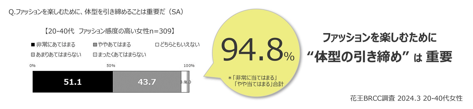さらに、94. 8%が「ファッションを楽しむために体型を引き締めることは重要」と回答。“ファッション感度の高い人”は体型への関心が高いことが明らかに。