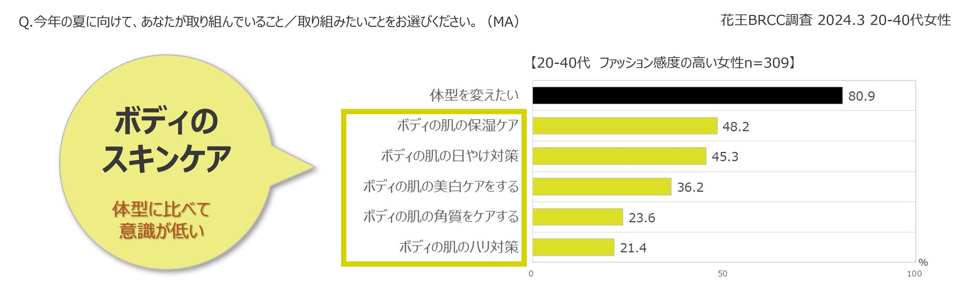 夏に向けて取り組みたいこととして、体型を変えたいと回答した人は80.9%と非常に高いのに対し、保湿ケアや日やけ対策など、“ボディのスキンケア”について回答した人はいずれも半数以下でした。