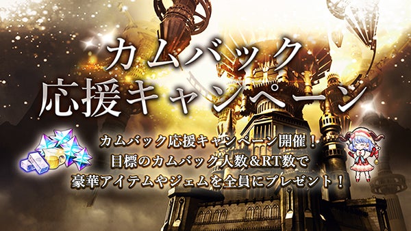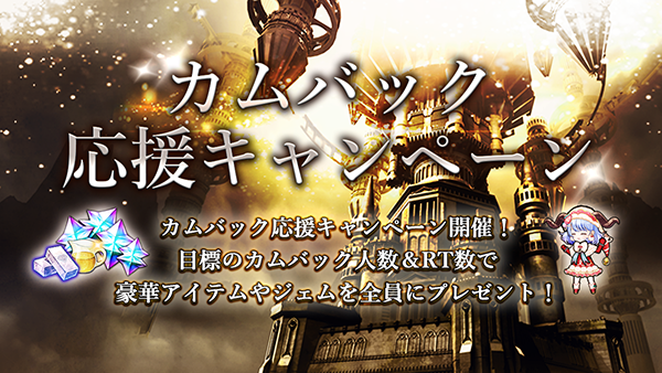 カムバック数とリツイート数が目標値に達すると全ユーザーに豪華アイテムやジェムをプレゼント!