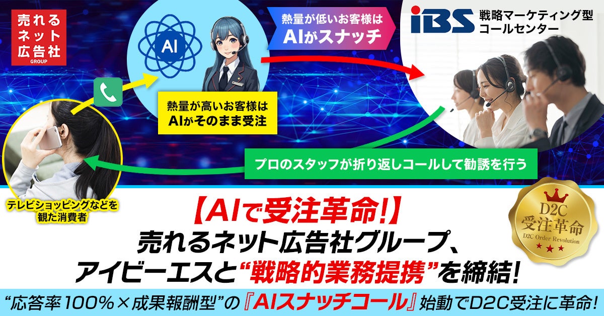 売れるネット広告社グループ株式会社(本社:福岡県福岡市、代表取締役社長CEO:加藤公一レオ、東証グロース市場:証券コード9235、以下 売れるネット広告社)は、戦略マーケティング型コールセンターサービスのリーディングカンパニーである株式会社アイビーエス(本社:東京都世田谷区、代表取締役:佐々木貴司)と“戦略的業務提携”を行い、D2C通販業界の常識を根底から覆す、かつてない次世代テレマーケティングサービス『AIスナッチコール』の提供を開始することをお知らせいたします。
