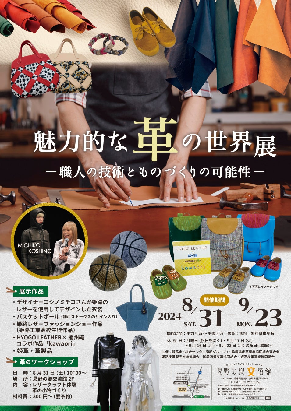 コシノミチコさんが姫路のレザーを使用してデザインした衣装、神戸ストークスのサイン入りバスケットボール、姫路工業高校の生徒が制作した姫路レザーファッションショー作品のほか、皮革産業の作業工程を解説したパネルなどを展示します。