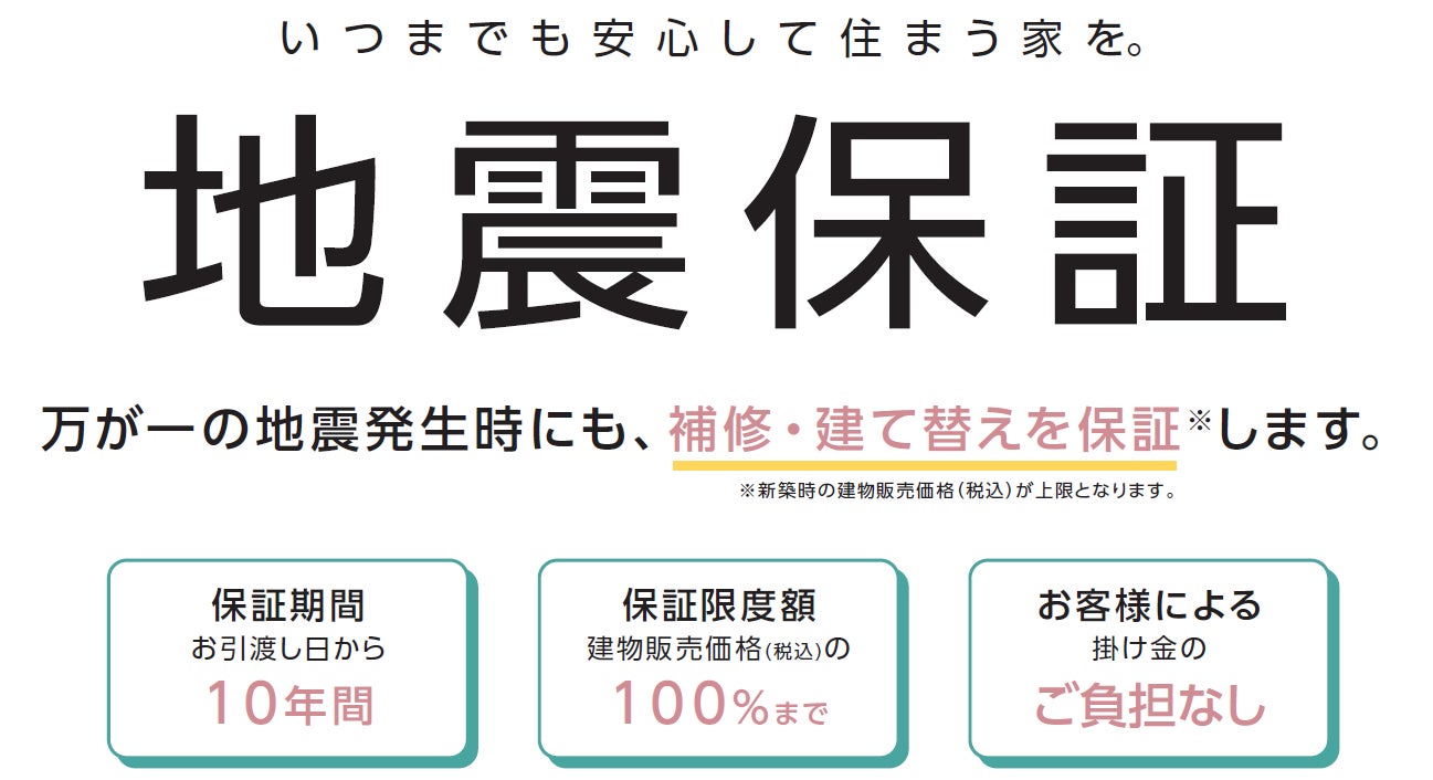 今回、これまで当社が取り組んできた耐震性の高い構造体の開発、繰り返しの地震にも強い構造の開発、建物の検査体制、実物大実験による安全性の実証など、積み重ねてきた住宅の耐震技術の向上を踏まえ、万が一、地震により住宅が全壊・大規模半壊・中規模半壊・半壊してしまった場合でも、補修・建て替え費用を建物販売価格(税込)の100%まで保証する「地震保証」のサービスとして当社3ブランドにて提供開始することとしました。