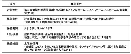 LIXIL住宅研究所は、これまでも万が一、住まいが地震の揺れを起因として建物が全壊した場合に限り、一定条件のもとに建替えを実施する場合、補償限度額2,000万円まで(建物本体価格100%又は補償限度額のいづれか低い金額)の建替え費用の一部を負担する「耐震補償」サービスを当社が運営するアイフルホーム、フィアスホーム、GLホームの3ブランドで提供してきました。