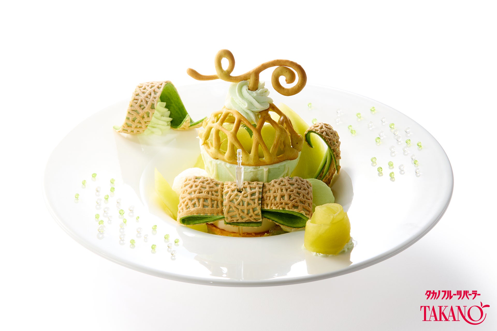 さわやかにレモンが香るダマンドとココナッツミルクババロアを重ね、その上にメロンをモチーフにしたメロンパルフェをあしらいました。パルフェの中にはメロンジャムやメロン果肉、メロンゼリーを閉じ込め、リボンを模った皮飾りとともに、プレゼントのような一皿に仕上げています。